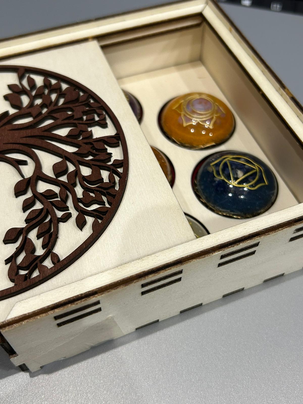 Orgonitová Čakrová Sada : Harmónia a Energia vo Vašom Živote Ponorte sa do sveta energetickej rovnováhy s touto nádhernou sadou siedmich orgonitových pologúľ, navrhnutých pre prácu s Vašimi siedmimi hlavnými čakrami. Čo je orgonit? Orgonit je zmes organickej živice, neorganických kovových častíc a kryštálov, ktorá podľa presvedčenia transformuje negatívnu energiu na pozitívnu a harmonizuje energiu orgónu alebo životnej sily vo Vašom prostredí. Sada 7 Čakier: Kľúč k Rovnováhe Každá pologuľa v tejto sade je starostlivo vytvorená tak, aby vizuálne, farebne a energeticky rezonovala s jednou z Vašich hlavných čakier, symbolizovaných zlatým alebo strieborným čakrovým symbolom na povrchu: Symbolika jednotlivých čakier: Korunná (Sahasrara) Fialová/Biela Duchovné spojenie, osvietenie Čelová/Tretie oko (Ajna) Indigo/Tmavomodrá Intuícia, múdrosť Krčná (Vishuddha) Svetlomodrá/Tyrkysová Komunikácia, sebavyjadrenie Srdcová (Anahata) Zelená Láska, súcit, uzdravenie Solar plexus (Manipura) Žltá/Žlto-oranžová Osobná sila, vôľa, sebaúcta Sakrálna (Svadhisthana) Oranžová Kreativita, emócie, radosť Koreňová (Muladhara) Červená/Tmavá oranžová Uzemnenie, prežitie, stabilita Vlastnosti a Použitie: Energetická Ochrana: Pomáha harmonizovať priestor a chrániť pred elektrosmogom.